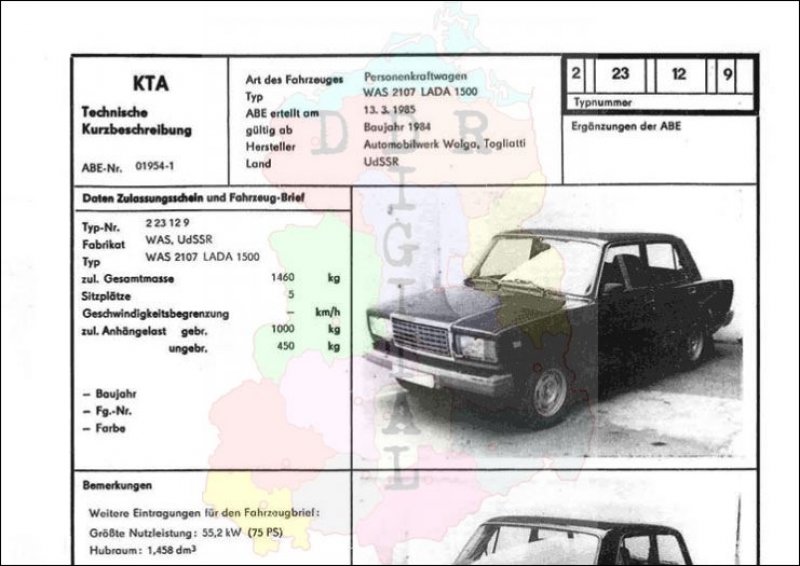 Art des Fahrzeuges: Personenkraftwagen Typ: WAS 2107 Lada 1500 ABE erteilt am: 13.03.1985 gültig ab: 1984 Hersteller: Automobilwerk Wolga Togliatti Land: UdSSR Ergänzung zur ABE: Typnummer: 223129 Anzahl Seiten: 2