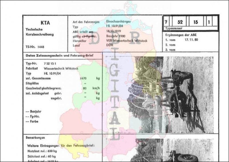 Art des Fahrzeuges: Einachsanhänger Typ: HL 10.91/04 ABE erteilt am: 18.10.1979 gültig ab: 1980 Hersteller: VEB Wassertechnik Wittstock Land: DDR Ergänzung zur ABE: 1. vom 17.11.1980 Typnummer 752151 Anzahl Seiten: 2