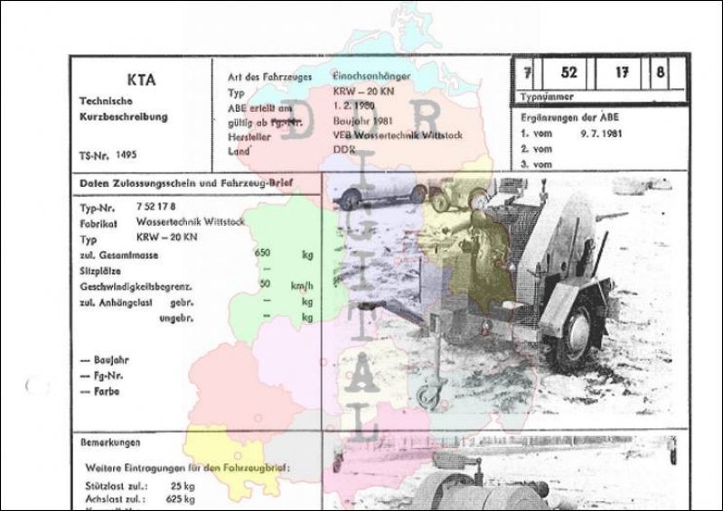Art des Fahrzeuges: Einachsanhänger Typ: KRW - 20 KN ABE erteilt am: 01.02.1980 gültig ab: 1981 Hersteller: VEB Wassertechnik Wittstock Land: DDR Ergänzung zur ABE: 1. vom 09.07.1981 Typnummer 752178 Anzahl Seiten: 2