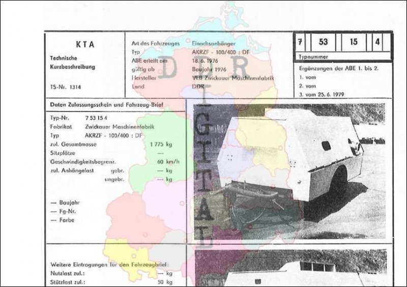 Art des Fahrzeuges: Einachsanhänger Typ: AKRZF-100/400 : DF ABE erteilt am: 18.06.1976 gültig ab: 1976 Hersteller: VEB Zwickauer Maschinenfabrik Land: DDR Ergänzung zur ABE: 3. vom 25.06.1979 Typnummer 753154 Anzahl Seiten: 2