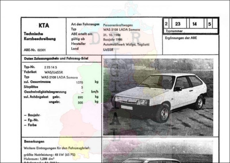 Art des Fahrzeuges: Personenkraftwagen Typ: WAS 2108 LADA Samara ABE erteilt am: 31.10.1986 gültig ab: 1986 Hersteller: Automobilwerk Wolga Togliatti Land: UdSSR Ergänzung zur ABE: Typnummer: 223145 Anzahl Seiten: 2