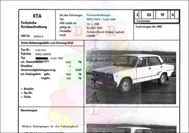 Art des Fahrzeuges: Personenkraftwagen Typ: WAS 21074 - Lada 1600 ABE erteilt am: 14.01.1988 gültig ab: 1985 Hersteller: Automobilwerk Wolga Togliatti Land: UdSSR Ergänzung zur ABE: Typnummer: 223196 Anzahl Seiten: 2