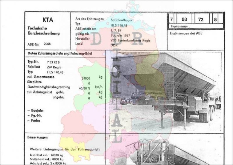 Art des Fahrzeuges: Sattelauflieger Typ: HLS 140.48 ABE erteilt am: 01.07.1987 gültig ab: 1987 Hersteller: VEB Zentralwerkstatt Regis Land: DDR Ergänzung zur ABE: Typnummer 753728 Anzahl Seiten: 2