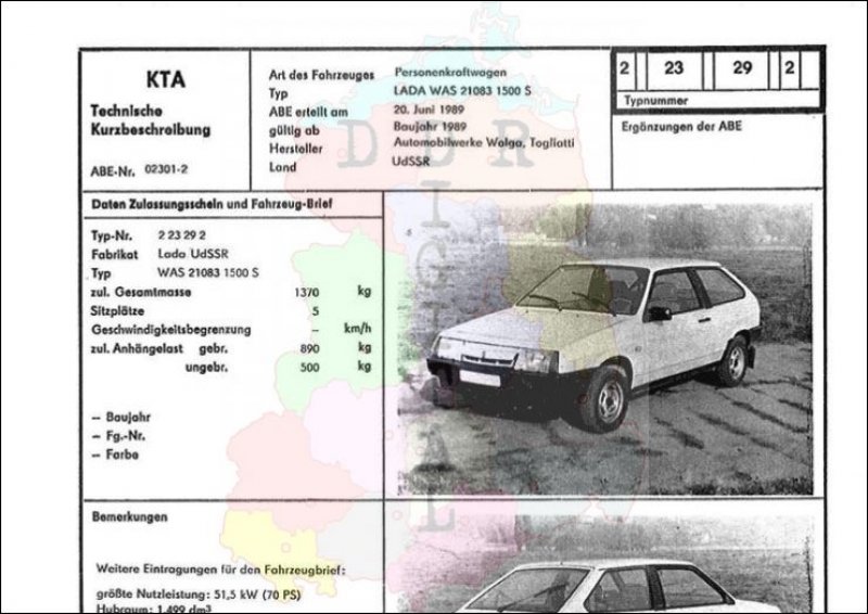 Art des Fahrzeuges: Personenkraftwagen Typ: LADA WAS 21083 1500 S ABE erteilt am: 20.06.1989 gültig ab: 1989 Hersteller: Automobilwerk Wolga Togliatti Land: UdSSR Ergänzung zur ABE: Typnummer: 223292 Anzahl Seiten: 2