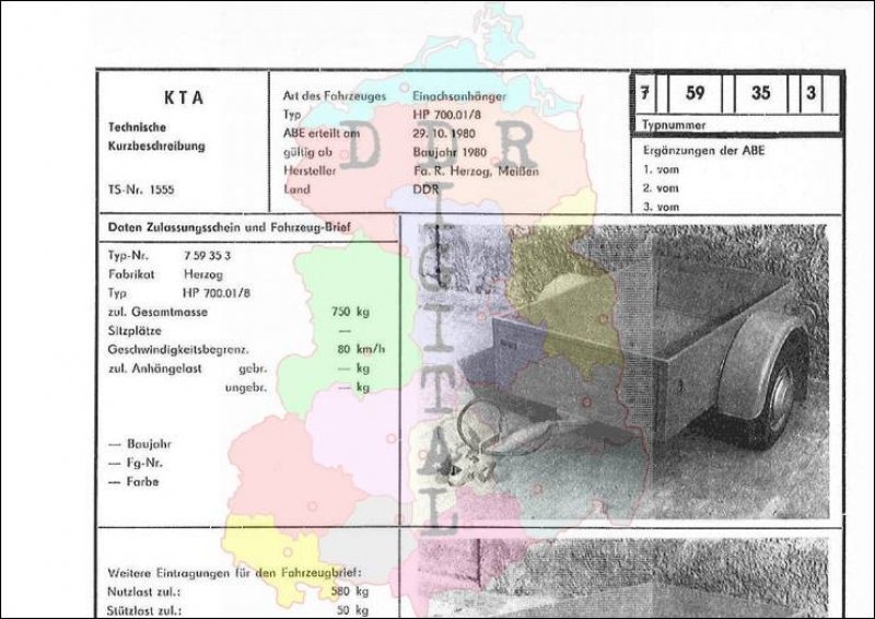 Art des Fahrzeuges: Einachsanhänger Typ: HP 700.01/8 ABE erteilt am: 29.10.1980 gültig ab: 1980 Hersteller: Fa. R. Herzog Meißen Land: DDR Ergänzung zur ABE: Typnummer 759353 Anzahl Seiten: 2