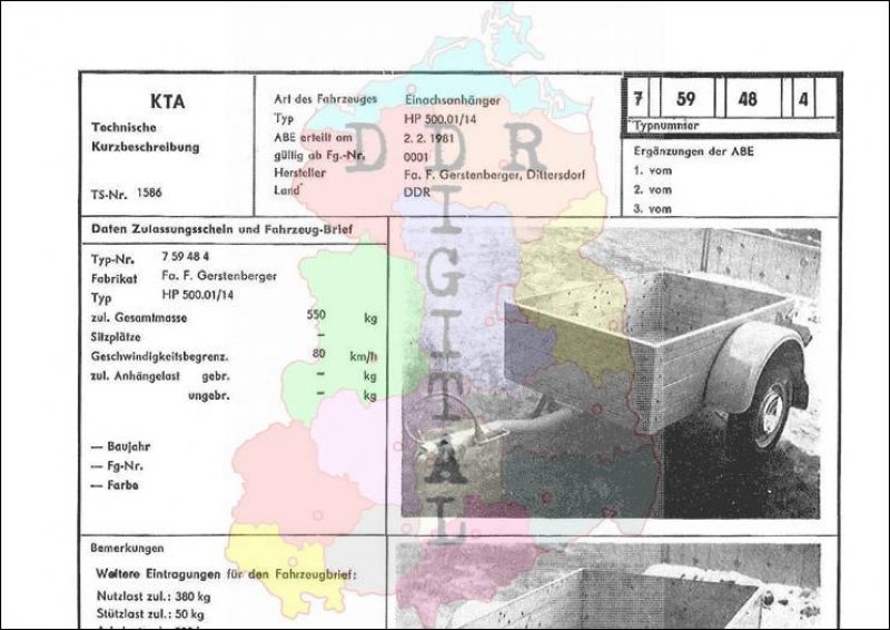 Art des Fahrzeuges: Einachsanhänger Typ: HP 500.01/14 ABE erteilt am: 02.02.1981 gültig ab Fg.-Nr.: 0001 Hersteller: Fa. F. Gerstenberger Dittersdorf Land: DDR Ergänzung zur ABE: Typnummer 759484 Anzahl Seiten: 2