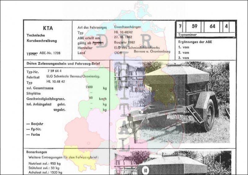 Art des Fahrzeuges: Einachsanhänger Typ: HL 10.48/42 ABE erteilt am: 27.10.1982 gültig ab: 1982 Hersteller: ELG des Schmiedehandwerks Bernau Land: DDR Ergänzung zur ABE: Typnummer 759644 Anzahl Seiten: 2