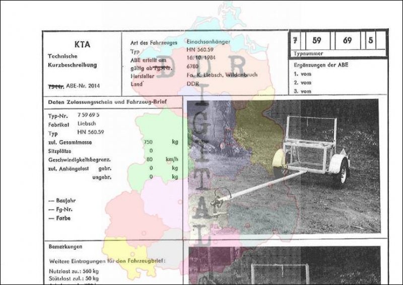 Art des Fahrzeuges: Einachsanhänger Typ: HN 560.59 ABE erteilt am: 16.10.1984 gültig ab Fg.-Nr.: 6780 Hersteller: Fa. K. Liebsch Wildenbusch Land: DDR Ergänzung zur ABE: Typnummer 759695 Anzahl Seiten: 2