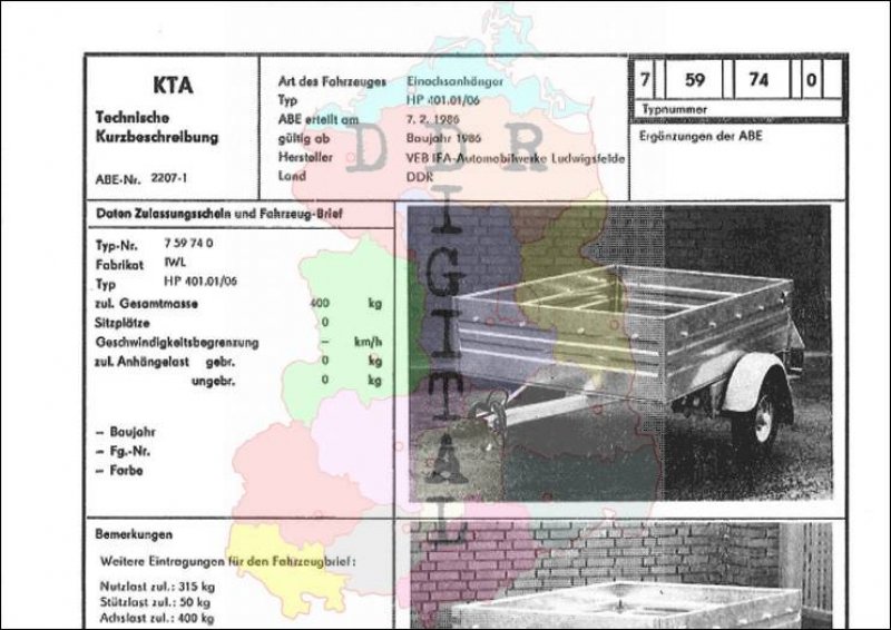 Art des Fahrzeuges: Einachsanhänger Typ: HP 401.01/06 ABE erteilt am: 07.02.1986 gültig ab: 1986 Hersteller: VEB IFA-Automobilwerke Ludwigsfelde Land: DDR Ergänzung zur ABE: Typnummer 759740 Anzahl Seiten: 2