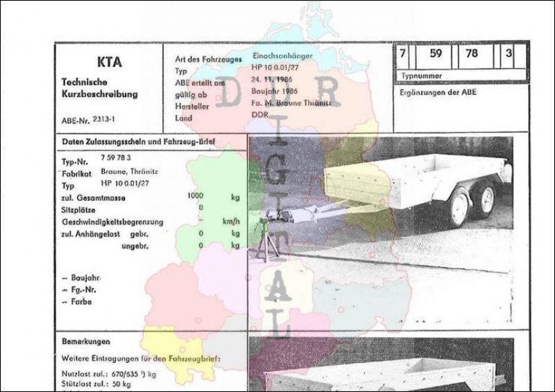 Art des Fahrzeuges: Einachsanhänger Typ: HP 100.01/7 ABE erteilt am: 24.11.1986 gültig ab: 1986 Hersteller: Fa. M. Braune Thrönitz Land: DDR Ergänzung zur ABE: Typnummer 759783 Anzahl Seiten: 2