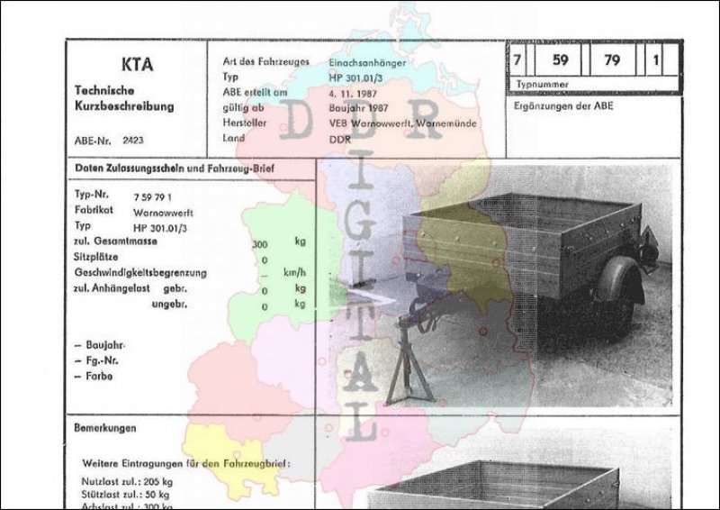 Art des Fahrzeuges: Einachsanhänger Typ: HP 301.01/3 ABE erteilt am: 04.11.1987 gültig ab: 1987 Hersteller: VEB Warnowerft Warnemünde Land: DDR Ergänzung zur ABE: Typnummer 759791 Anzahl Seiten: 2