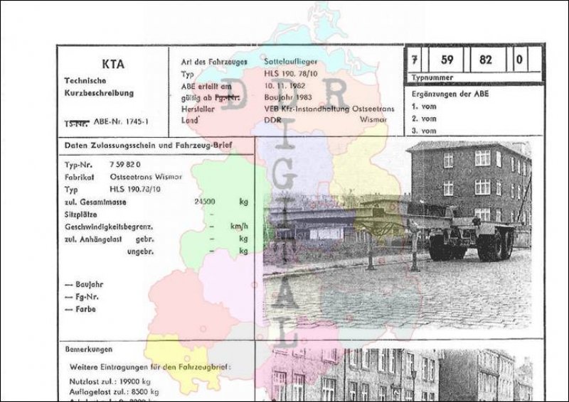 Art des Fahrzeuges: Sattelauflieger Typ: HLS 190.78/10 ABE erteilt am: 10.11.1982 gültig ab: 1983 Hersteller: VEB Kfz-Instandhaltung Ostseetrans Wismar Land: DDR Ergänzung zur ABE: Typnummer 759820 Anzahl Seiten: 2