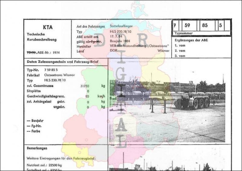 Art des Fahrzeuges: Sattelauflieger Typ: HLS 230.78/10 ABE erteilt am: 17.07.1984 gültig ab: 1984 Hersteller: VEB Kfz-Instandhaltung Ostseetrans Wismar Land: DDR Ergänzung zur ABE: Typnummer 759855 Anzahl Seiten: 2