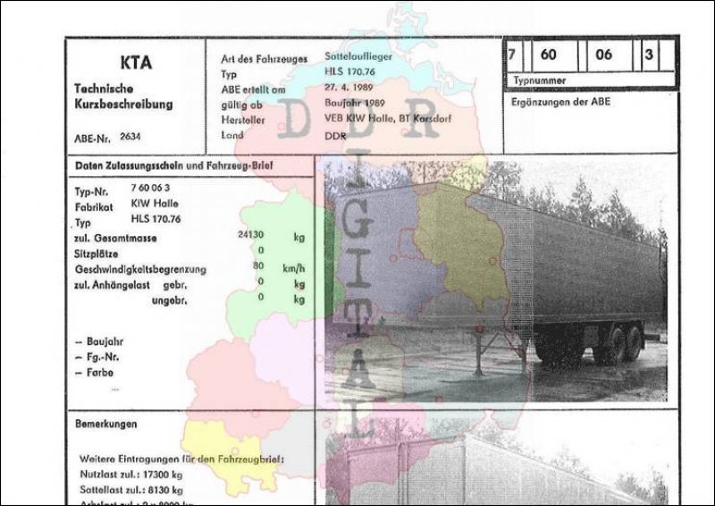 Art des Fahrzeuges: Sattelauflieger Typ: HLS 170.76 ABE erteilt am: 27.04.1989 gültig ab: 1989 Hersteller: VEB KIW Halle, BT Karsdorf Land: DDR Ergänzung zur ABE: Typnummer 760063 Anzahl Seiten: 2