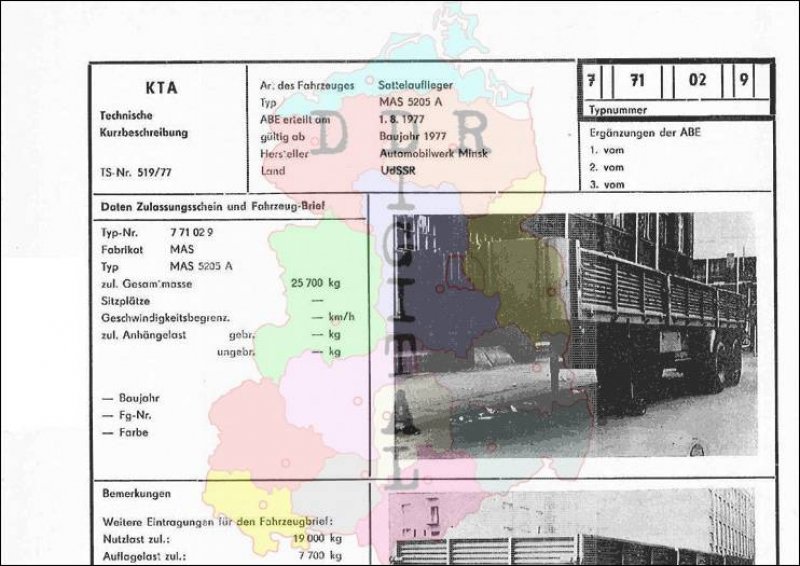 Art des Fahrzeuges: Sattelauflieger Typ: MAS 5205 A ABE erteilt am: 01.08.1977 gültig ab: 1977 Hersteller: Automobilwerk Minsk Land: UdSSR Ergänzung zur ABE: Typnummer 771029 Anzahl Seiten: 2