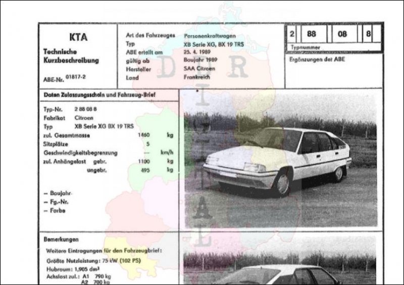 Art des Fahrzeuges: Personenkraftwagen Typ: XB Serie XG, BX 19 TRS ABE erteilt am: 25.04.1989 gültig ab: 1989 Hersteller: SAA Citroen Land: Frankreich Ergänzung zur ABE: Typnummer: 288088 Anzahl Seiten: 2