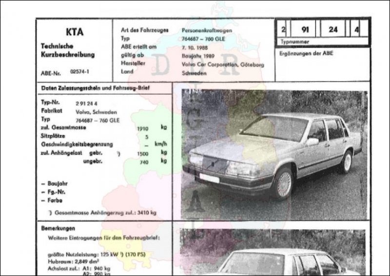Art des Fahrzeuges: Personenkraftwagen Typ: 764687 - 760 GLE ABE erteilt am: 07.10.1988 gültig ab: 1989 Hersteller: Volvo Car Corporation, Göteborg Land: Schweden Ergänzung zur ABE: Typnummer: 291244 Anzahl Seiten: 2