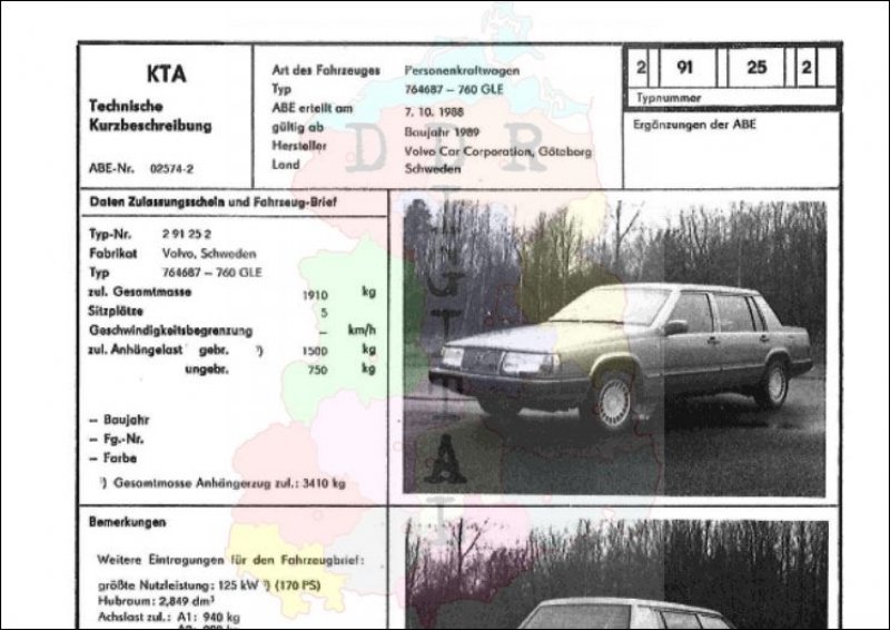 Art des Fahrzeuges: Personenkraftwagen Typ: 764687 - 760 GLE ABE erteilt am: 07.10.1988 gültig ab: 1989 Hersteller: Volvo Car Corporation, Göteborg Land: Schweden Ergänzung zur ABE: Typnummer: 291252 Anzahl Seiten: 2