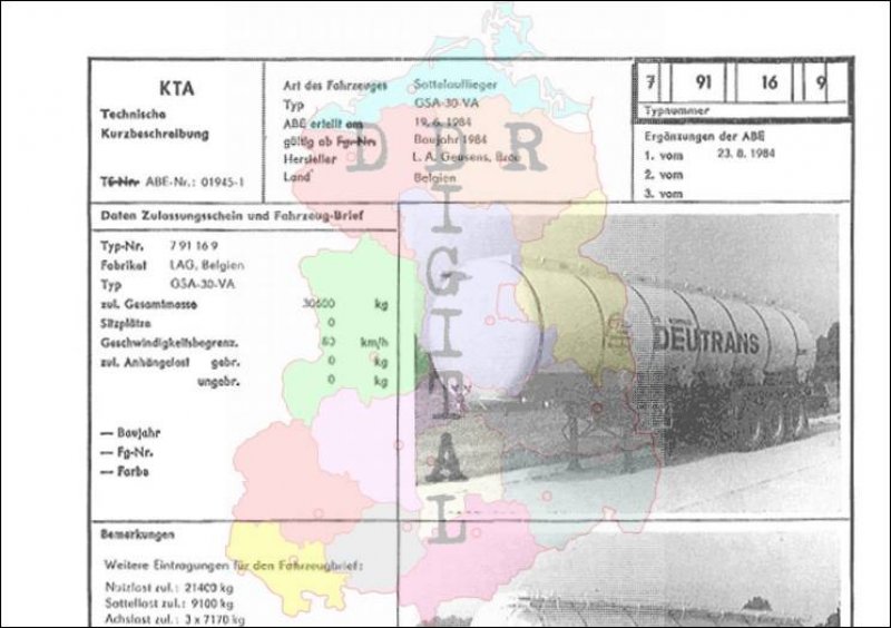 Art des Fahrzeuges: Sattelauflieger Typ: GSA-30-VA ABE erteilt am: 19.06.1984 gültig ab: 1984 Hersteller: L. A. Geusens, Bree Land: Belgien Ergänzung zur ABE: 1. vom 23.08.1984 Typnummer 791169 Anzahl Seiten: 2