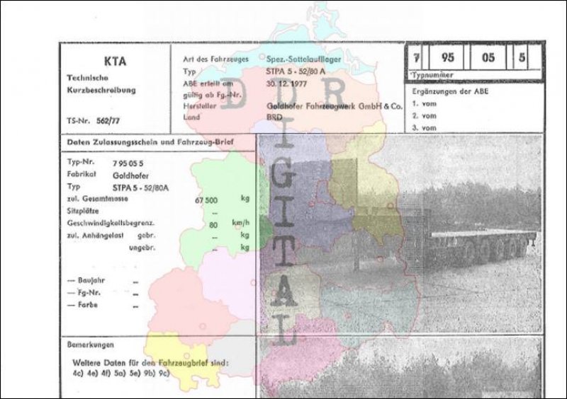 Art des Fahrzeuges: Spez.-Sattelauflieger Typ: STPA 5 - 52/80 A ABE erteilt am: 30.12.1977 gültig ab: Hersteller: Goldhofer Fahrzeugwerk GmbH & Co. Land: BRD Ergänzung zur ABE: Typnummer 795055 Anzahl Seiten: 2