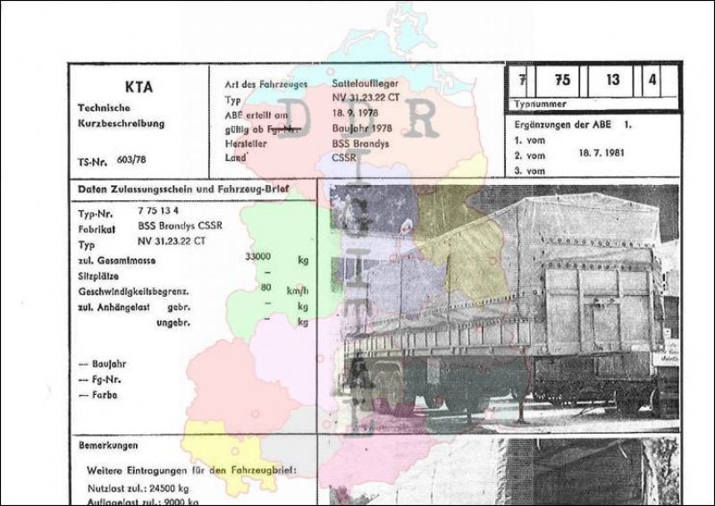 Art des Fahrzeuges: Sattelauflieger Typ: NV 31.23.22 CT ABE erteilt am: 18.09.1978 gültig ab: 1978 Hersteller: BSS Brandys Land: CSSR Ergänzung zur ABE: 2. vom 18.07.1981 Typnummer 775134 Anzahl Seiten: 2