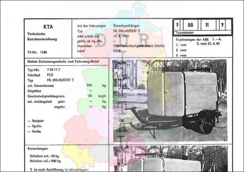 Art des Fahrzeuges: Einachsanhänger Typ: HL 900.40/VTA ABE erteilt am: 17.04.1972 gültig ab Fg.-Nr.: Hersteller: VEB Feuerlöschgerätewerk Görlitz Land: DDR Ergänzung zur ABE: 5. vom 21.04.1981 Typnummer 755117 Anzahl Seiten: 2