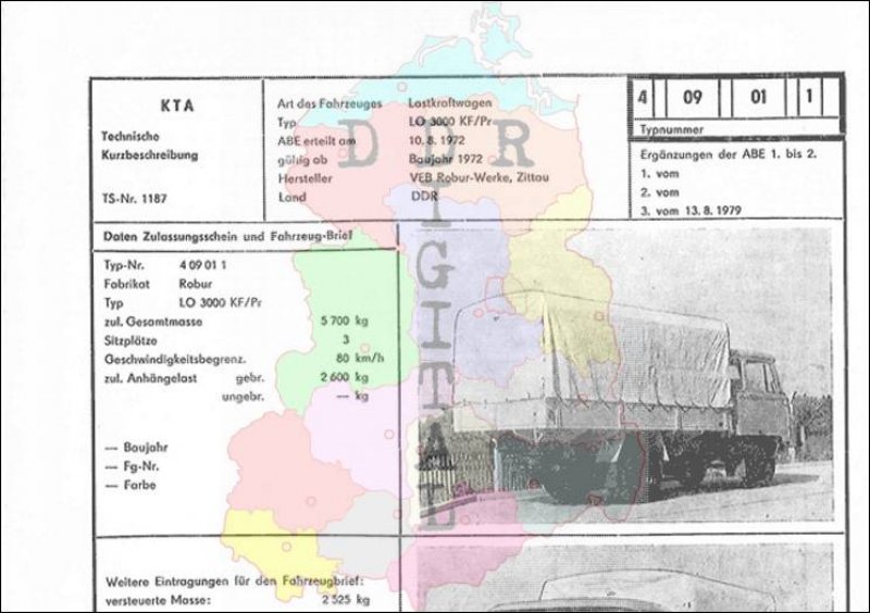 Art des Fahrzeuges: Lastkraftwagen Typ: LD 3000 KF/Pr ABE erteilt am: 10.08.1972 gültig ab: 1972 Hersteller: VEB Robur-Werke Zittau Land: DDR Ergänzung zur ABE: 3. vom 13.08.1979 Typnummer: 409011 Anzahl Seiten: 2