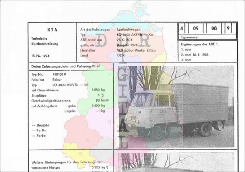 Art des Fahrzeuges: Lastkraftwagen Typ: LO 3000 AKF/St-Ko ABE erteilt am: 26.06.1974 gültig ab: 1973 Hersteller: VEB Robur-Werke Zittau Land: DDR Ergänzung zur ABE: 2. vom 16.01.1978 Typnummer: 409089 Anzahl Seiten: 2