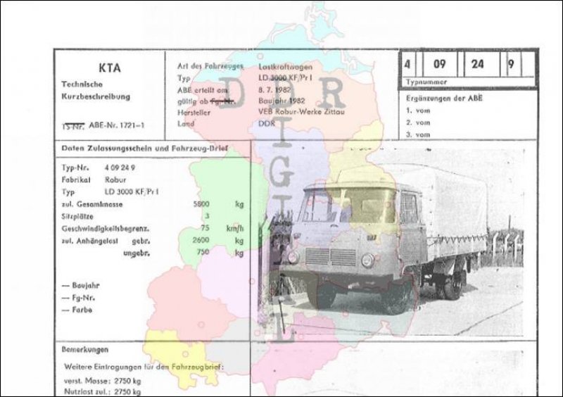 Art des Fahrzeuges: Lastkraftwagen Typ: LD 3000 KF/Pr I ABE erteilt am: 08.07.1982 gültig ab: 1982 Hersteller: VEB Robur-Werke Zittau Land: DDR Ergänzung zur ABE: Typnummer: 409249 Anzahl Seiten: 2