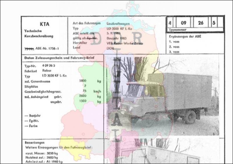 Art des Fahrzeuges: Lastkraftwagen Typ: LD 3000 KF L-Ko ABE erteilt am: 05.01.1983 gültig ab: 1983 Hersteller: VEB Robur-Werke Zittau Land: DDR Ergänzung zur ABE: Typnummer: 409265 Anzahl Seiten: 2