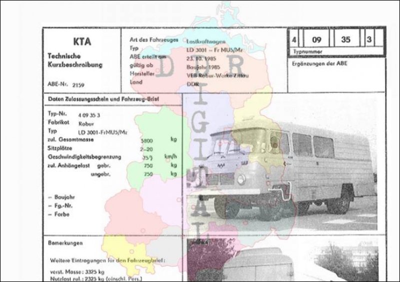 Art des Fahrzeuges: Lastkraftwagen Typ: LD 3001 - Fr MU5/MZ ABE erteilt am: 23.10.1985 gültig ab: 1985 Hersteller: VEB Robur-Werke Zittau Land: DDR Ergänzung zur ABE: Typnummer: 409353 Anzahl Seiten: 2