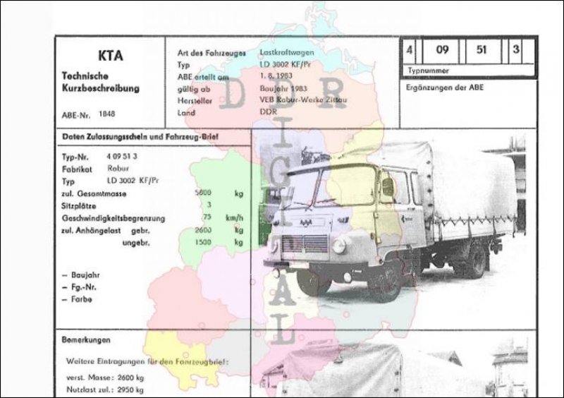 Art des Fahrzeuges: Lastkraftwagen Typ: LD 3002 KF/Pr ABE erteilt am: 01.08.1983 gültig ab: 1983 Hersteller: VEB Robur-Werke Zittau Land: DDR Ergänzung zur ABE: Typnummer: 409513 Anzahl Seiten: 2