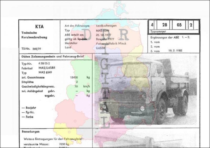 Art des Fahrzeuges: Lastkraftwagen Typ: MAS 5549 ABE erteilt am: 20.12.1977 gültig ab: 1977 Hersteller: Automobilwerk Minsk Land: UdSSR Ergänzung zur ABE: 3. vom 18.02.1982 Typnummer: 428052 Anzahl Seiten: 2