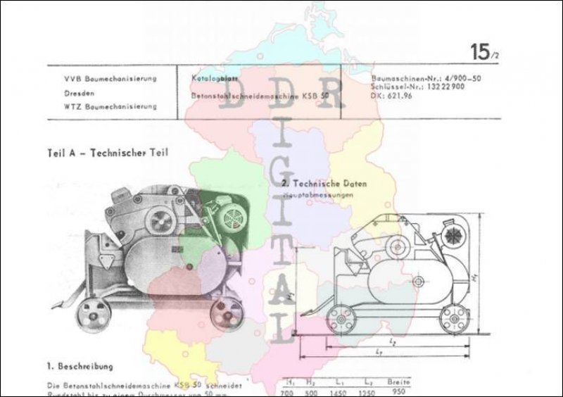 Teil A - Technischer Teil, enthält die allgemeine Beschreibung des Maschinentyps unter Berücksichtigung wesentlicher Merkmale technischer Art, wie z.B. Abmessungen, Arbeitsgeschwindigkeit, Antrieb, Getrieb u.a.