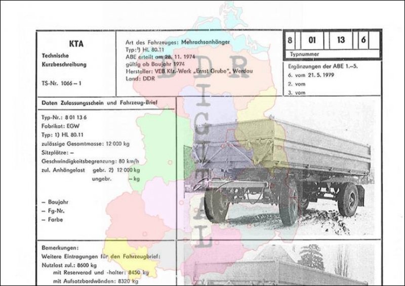 Art des Fahrzeuges: Mehrachsanhänger Typ: HL 80.11 ABE erteilt am: 28.11.1974 gültig ab: 1974 Hersteller: VEB Kraftfahrzeugwerk Ernst Grube Werdau Land: DDR Ergänzung zur ABE: 6. vom 21.05.1979 Typnummer 801136 Anzahl Seiten: 3