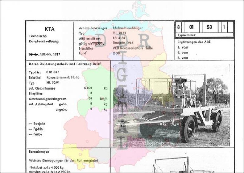 Art des Fahrzeuges: Mehrachsanhänger Typ: HL 70.91 ABE erteilt am: 18.04.1984 gültig ab: 1984 Hersteller: VEB Karosseriewerk Halle Land: DDR Ergänzung zur ABE: Typnummer 801531 Anzahl Seiten: 2