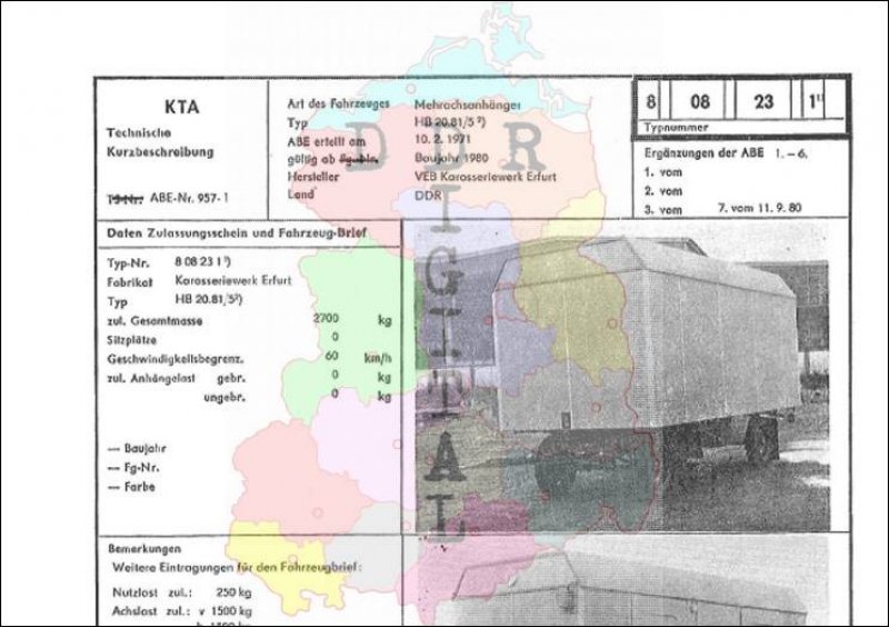 Art des Fahrzeuges: Mehrachsanhänger Typ: HL 20.81/6 ABE erteilt am: 10.02.1971 gültig ab: 1980 Hersteller: VEB Karosseriewerk Erfurt Land: DDR Ergänzung zur ABE: 7. vom 11.09.1980 Typnummer 808258 Anzahl Seiten: 2
