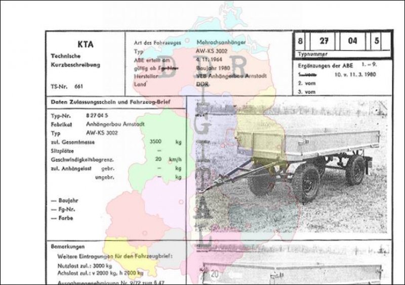 Art des Fahrzeuges: Mehrachsanhänger Typ: AW-KS 3002 ABE erteilt am: 04.11.1964 gültig ab: 1980 Hersteller: VEB Anhängerbau Arnstadt Land: DDR Ergänzung zur ABE: 10. vom 11.03.1990 Typnummer 827045 Anzahl Seiten: 2