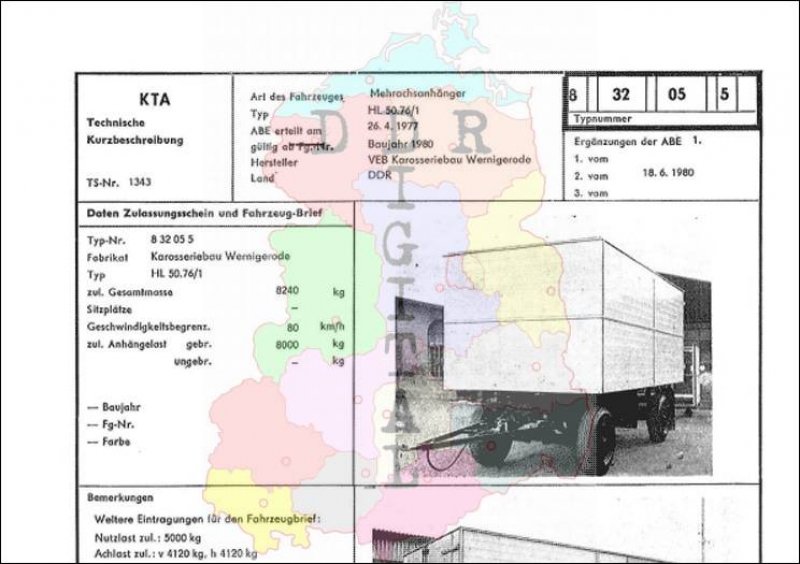 Art des Fahrzeuges: Mehrachsanhänger Typ: HL 50.76/1 ABE erteilt am: 26.04.1977 gültig ab: 1980 Hersteller: VEB Karosseriebau Wernigerode Land: DDR Ergänzung zur ABE: 2. vom 18.06.1980 Typnummer 832055 Anzahl Seiten: 2