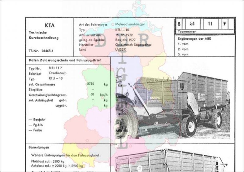 Art des Fahrzeuges: Mehrachsanhänger Typ: KTU - 10 ABE erteilt am: 15.12.1979 gültig ab: 1979 Hersteller: Orselmasch Saparoshez Land: UdSSR Ergänzung zur ABE: Typnummer 851117 Anzahl Seiten: 2