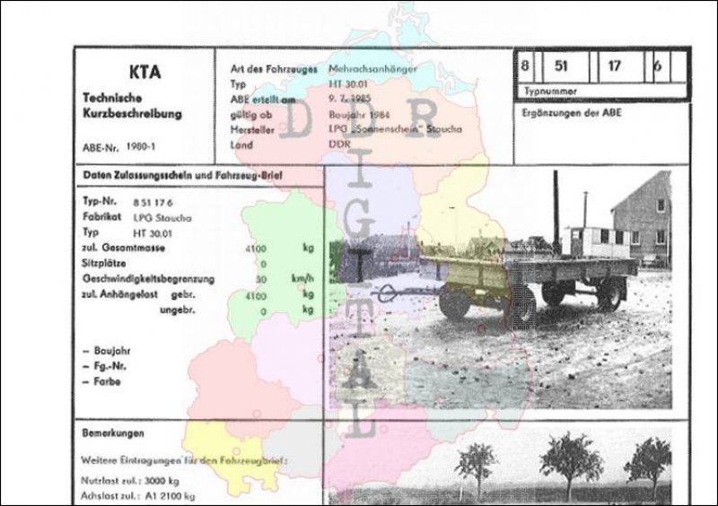Art des Fahrzeuges: Mehrachsanhänger Typ: HT 30.01 ABE erteilt am: 09.07.1985 gültig ab: 1984 Hersteller: LPG Sonnenschein Staucha Land: DDR Ergänzung zur ABE: Typnummer 851176 Anzahl Seiten: 2
