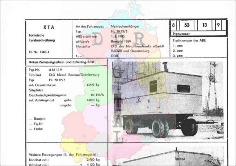 Art des Fahrzeuges: Mehrachsanhänger Typ: HL 70.72/3 ABE erteilt am: 01.03.1980 gültig ab: 1980 Hersteller: ELG des Metallhandwerks eGmbH Bernau und Oranienburg Land: DDR Ergänzung zur ABE: Typnummer 853139 Anzahl Seiten: 2