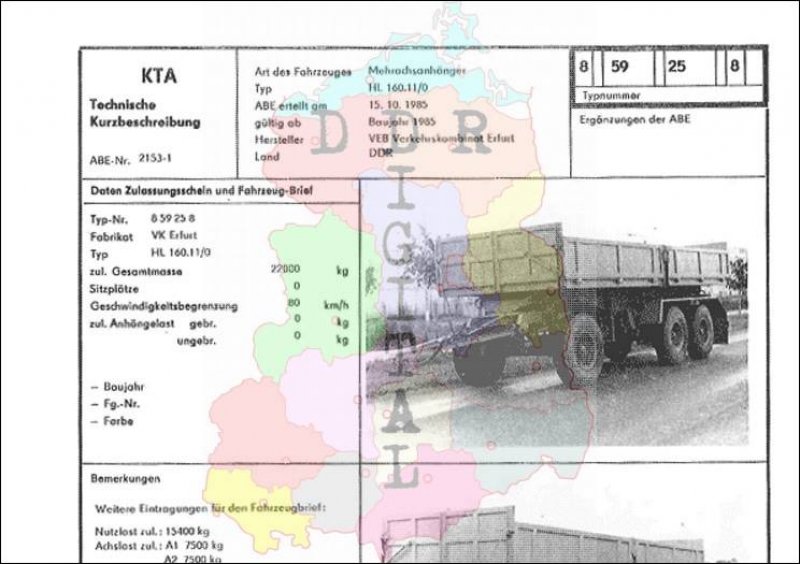 Art des Fahrzeuges: Mehrachsanhänger Typ: HL 160.11/0 ABE erteilt am: 15.10.1985 gültig ab: 1985 Hersteller: VEB Verkehrskombinat Erfurt Land: DDR Ergänzung zur ABE: Typnummer 859258 Anzahl Seiten: 2