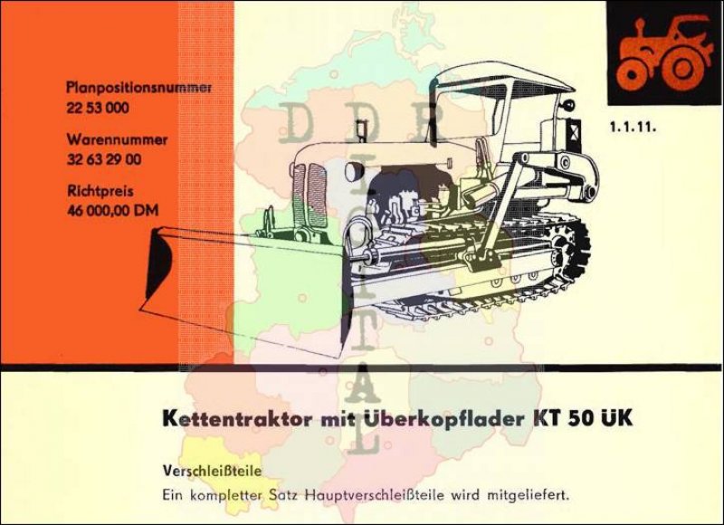 Herausgeber: VVB Landmaschinen- und Traktornbau Leipzig Entwicklungs- und Herstellerbetrieb: VEB Brandeburger Traktorenwerke Herstellerbetrieb für Überkopflader: VEB Fahrzeughydraulik Frankenberg Anzahl Seiten: 2 In dem Landmaschinen-Katalog sind Maschinen und Geräte enthalten, welche zur weiteren Mechanisierung in der sozialistischen Landwirtschaft bestimmt waren. Dieser Katalog sollte die Genossenschaften bei der Planung neuer Technik für ihren Betrieb unterstützen.