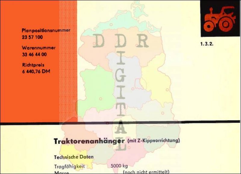 Herausgeber: VVB Landmaschinen- und Traktornbau Leipzig Entwicklungs- und Herstellerbetrieb: VEB Schlepperanhängerbau Ernst Thälmann Lübtheen Anzahl Seiten: 2 In dem Landmaschinen-Katalog sind Maschinen und Geräte enthalten, welche zur weiteren Mechanisierung in der sozialistischen Landwirtschaft bestimmt waren. Dieser Katalog sollte die Genossenschaften bei der Planung neuer Technik für ihren Betrieb unterstützen.