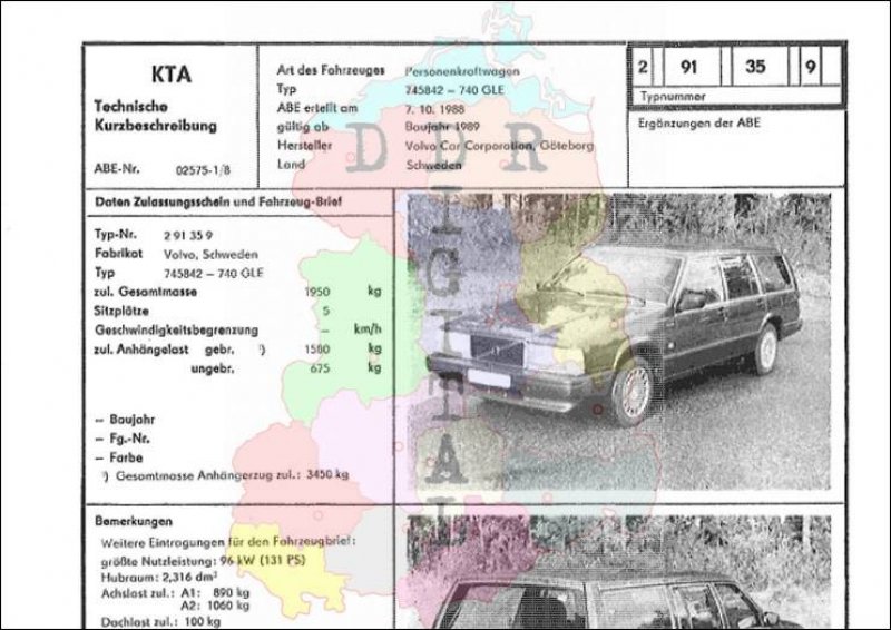 Art des Fahrzeuges: Personenkraftwagen Typ: 745842 - 740 GLE ABE erteilt am: 07.10.1988 gültig ab: 1989 Hersteller: Volvo Car Corporation, Göteborg Land: Schweden Ergänzung zur ABE: Typnummer: 291359 Anzahl Seiten: 2