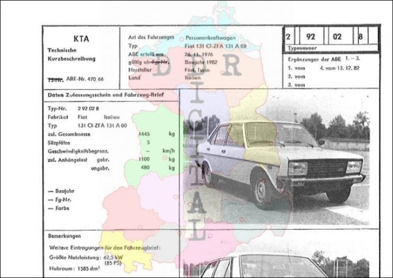 Art des Fahrzeuges: Personenkraftwagen Typ: Fiat 131 CI-ZFA 131 A 00 ABE erteilt am: 26.11.1976 gültig ab: 1982 Hersteller: Fiat, Turin Land: Italien Ergänzung zur ABE: 4. vom 13.12.1982 Typnummer: 292028 Anzahl Seiten: 2