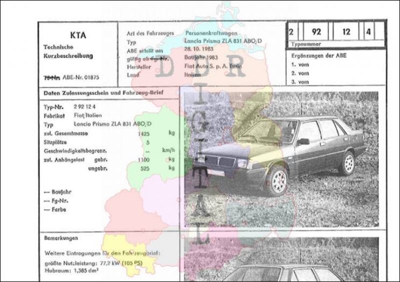 Art des Fahrzeuges: Personenkraftwagen Typ: Lancia Prisma ZKA 831 ABO/D ABE erteilt am: 28.10.1983 gültig ab: 1983 Hersteller: Fiat Auto S.p.A. Turin Land: Italien Ergänzung zur ABE: Typnummer: 292124 Anzahl Seiten: 2