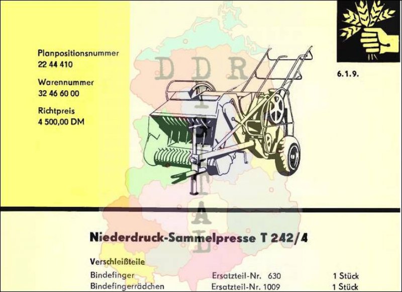 Herausgeber: VVB Landmaschinen- und Traktornbau Leipzig Entwicklungs und Herstellerbetrieb: VEB "Fortschritt" Erntebergungsmaschinen Neustadt / Sa. Anzahl Seiten: 3 In dem Landmaschinen-Katalog sind Maschinen und Geräte enthalten, welche zur weiteren Mechanisierung in der sozialistischen Landwirtschaft bestimmt waren. Dieser Katalog sollte die Genossenschaften bei der Planung neuer Technik für ihren Betrieb unterstützen.