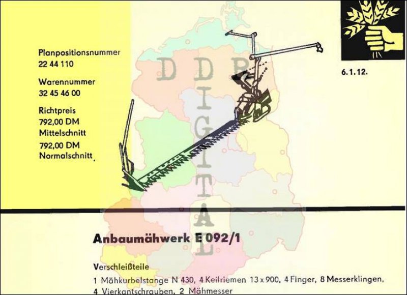 Herausgeber: VVB Landmaschinen- und Traktornbau Leipzig Entwicklungsrbetrieb: VEB "Fortschritt" Erntebergungsmaschinen Neustadt / Sa. Herstellerbetrieb: VEB "DIMA" Landmaschinenbau Dingelstädt / Eichsfeld 2 In dem Landmaschinen-Katalog sind Maschinen und Geräte enthalten, welche zur weiteren Mechanisierung in der sozialistischen Landwirtschaft bestimmt waren. Dieser Katalog sollte die Genossenschaften bei der Planung neuer Technik für ihren Betrieb unterstützen.